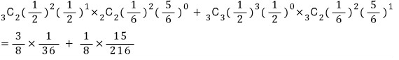 (갑순이 앞면 2개)(갑돌이 주사위 2개 던져 2개 모두 5) + (갑순이 앞면 3개)(갑돌이 주사위 3개 던져 5가 2개)