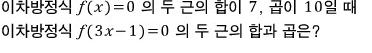 이차방정식 f(3x)=0 의 두 근의 합과 곱은?