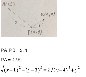 두 점 A(1, 3), B(4, 0)에 이르는 거리의 비가 2:1인